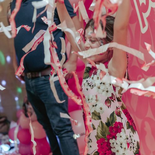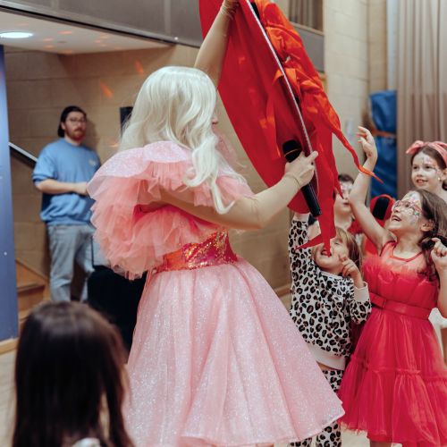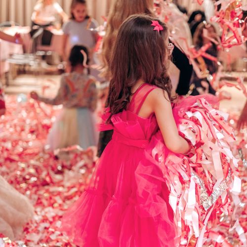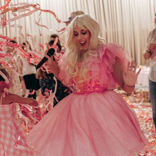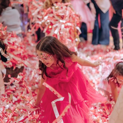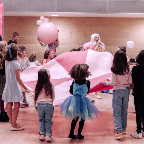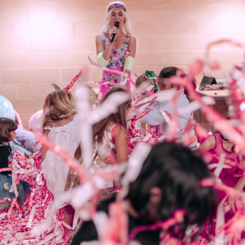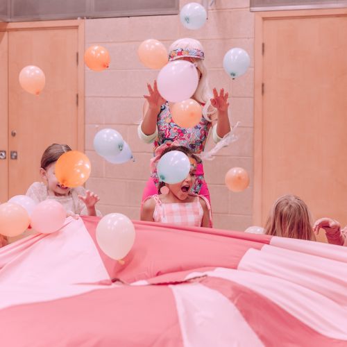 The kids loved the surprise balloon, glitter tattoos, face painting, and danced away at our pink paper disco with our signature air blower!